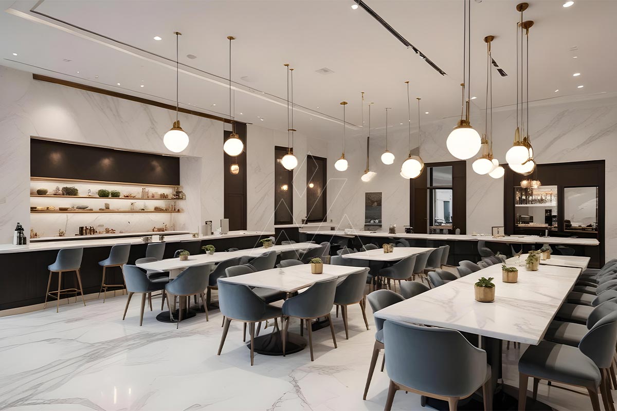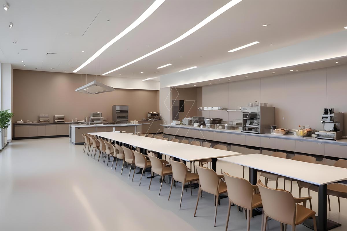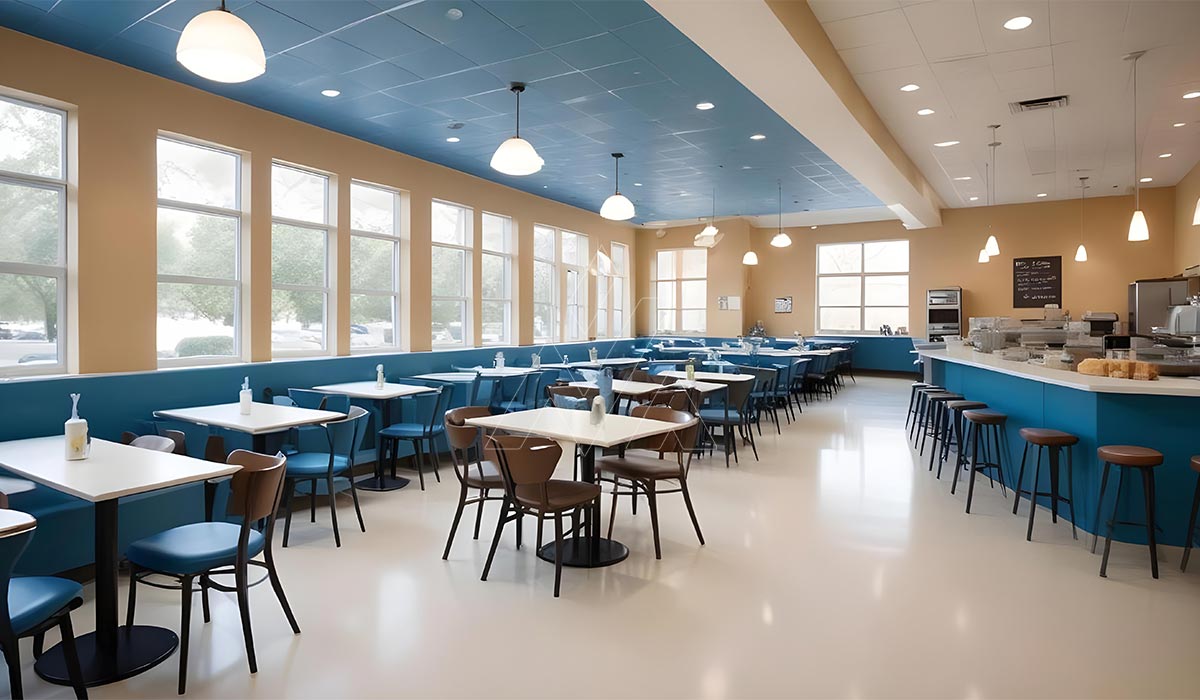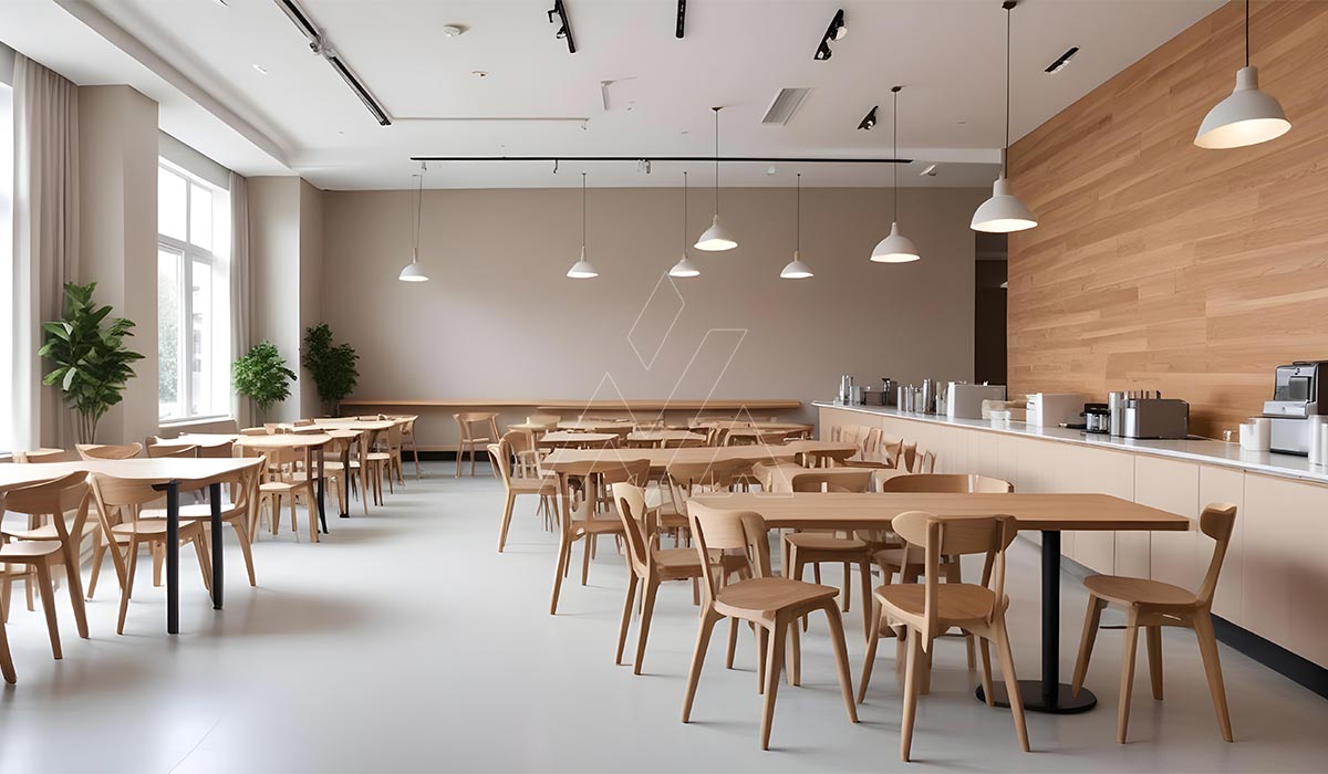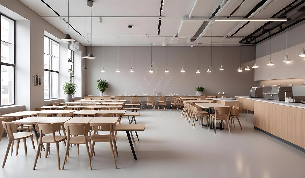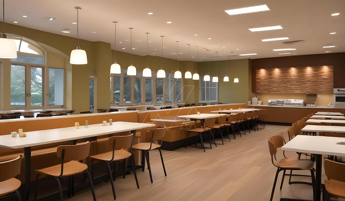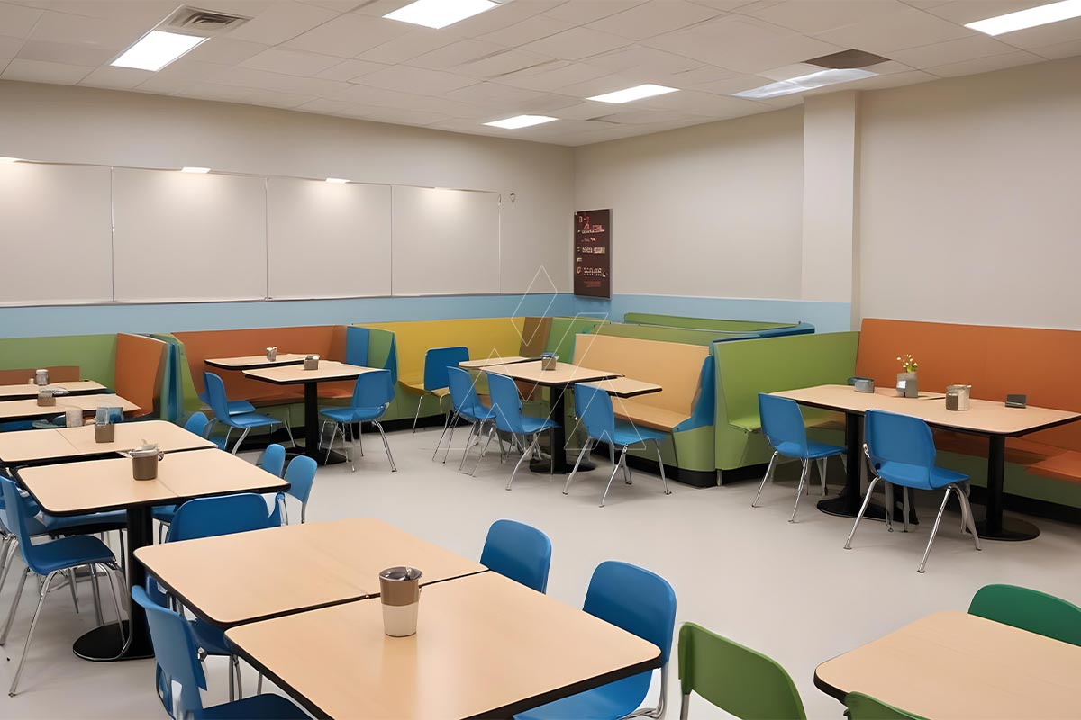 • A strategic color scheme helps define the space’s mood. For a simple cafeteria interior design, light colors like white or pastels can open up smaller areas and create a feeling of spaciousness. For a modern cafeteria interior design, bolder colors, such as deep blues or rich browns paired with neutral accents,s can provide warmth and sophistication without overwhelming the space.