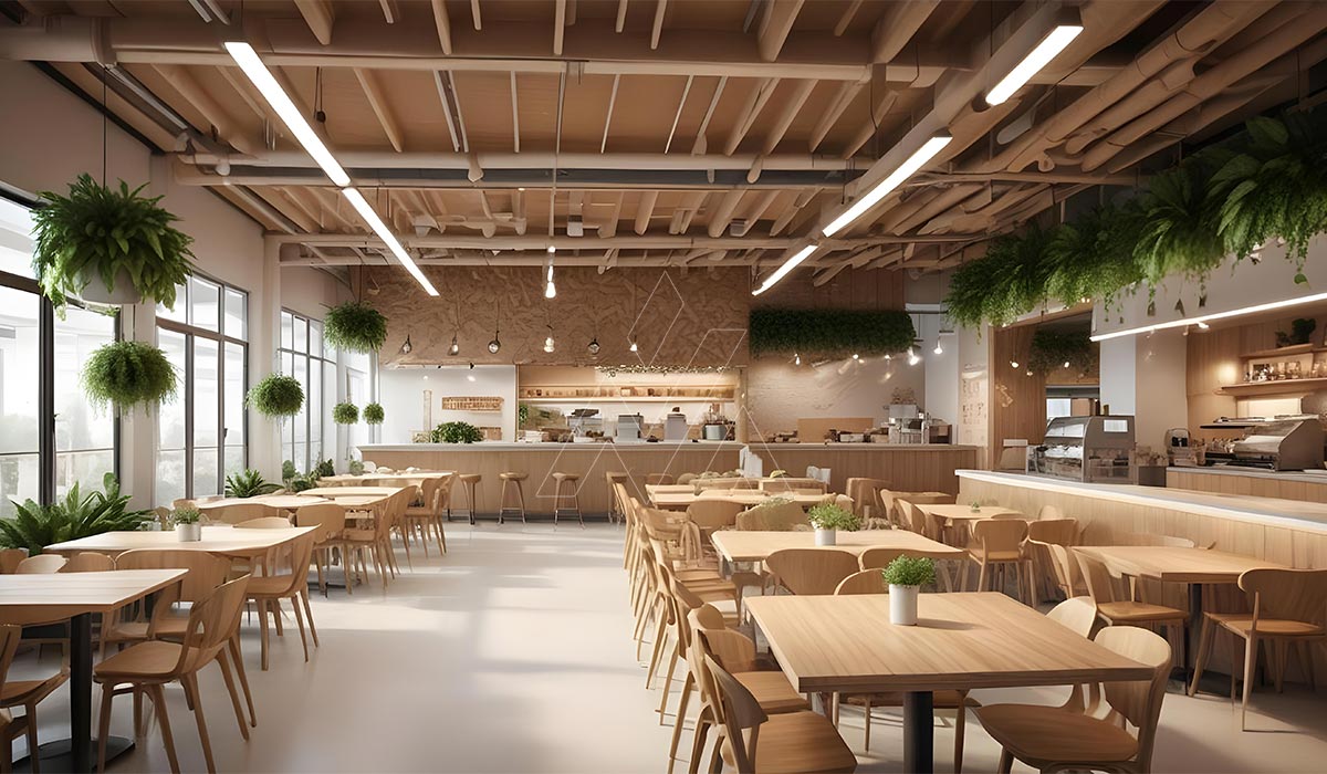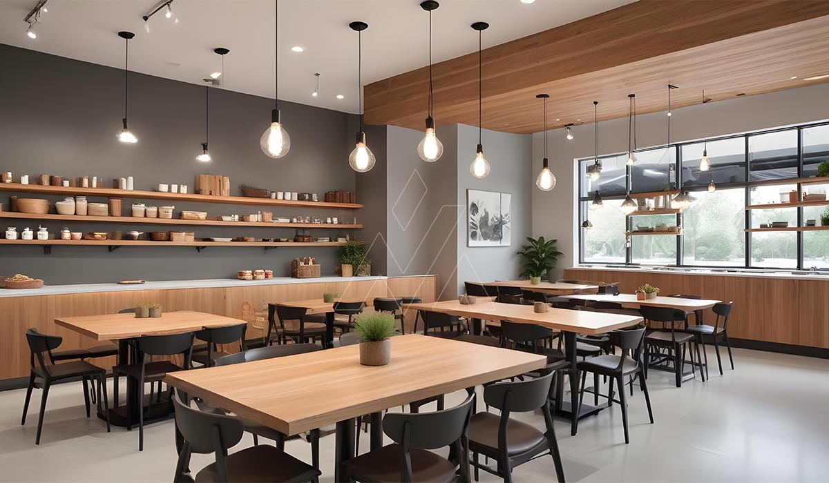 • Proper lighting is essential to setting the right mood. Cafeterias often need ambient and task lighting to create an inviting atmosphere. In modern cafeteria interior design, pendant lights or track lighting are frequently used for their sleek, contemporary appeal. Low-budget cafe interior design can incorporate more affordable lighting options that create a welcoming ambiance.