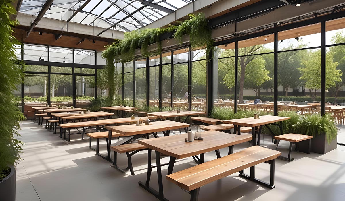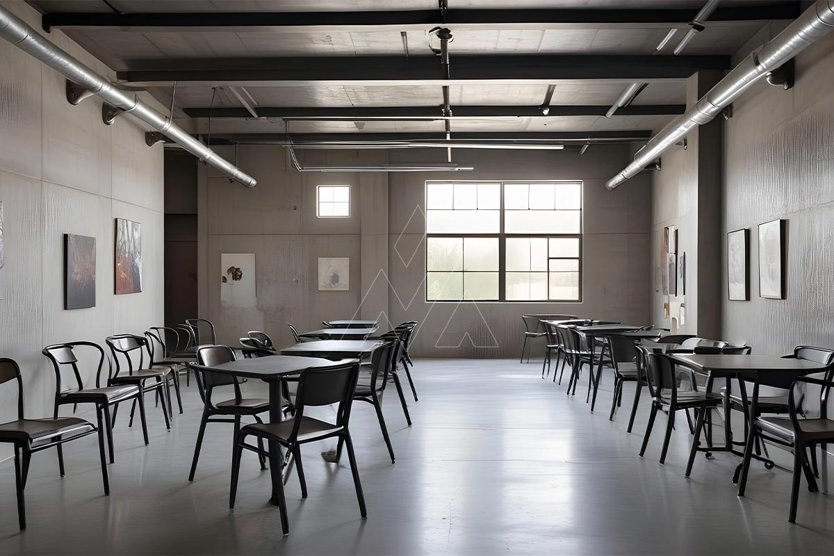 • The choice of materials plays a significant role in the durability and aesthetics of a cafeteria. For low-budget cafeteria interior design, choosing or using cost-effective materials like metal, reclaimed wood, or laminate finishes can give the space an upscale look without exceeding your budget. Furniture such as modular tables and stackable chairs ensures flexibility, particularly for small cafeterias.