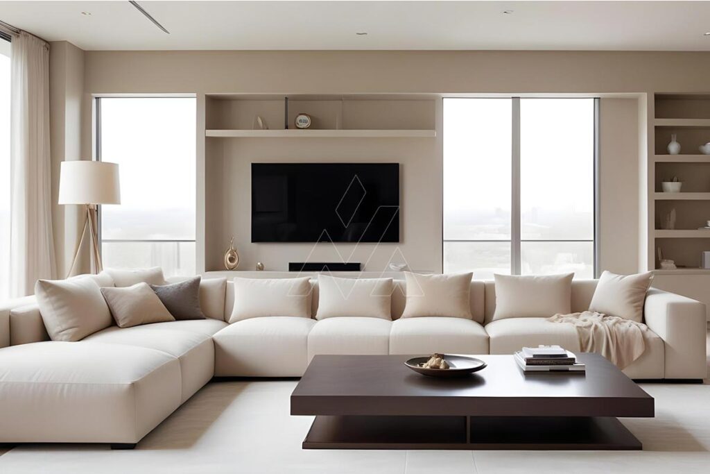 Choose white, gray, or beige for a modern look. Add small bits of color with cushions or art in your modern living room on a budget in Dhaka.